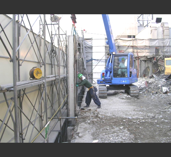 立地が銀座4丁目という事、構造が鉄骨造8F建PC外壁という難工事で工事計画が非常に重要でした。小型クレーンと小型重機と人力の融合で搬出は時間制限の中で行いました。