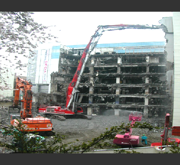 地方都市のメインストリート沿い、神社の表参道脇等、第三者に向けての細心の注意が必要でした。重機も足元が低く塔屋まで入れると30m級の高さにも余裕の950(自重160t)級のロングブームで解体し作業能率も充分でした。