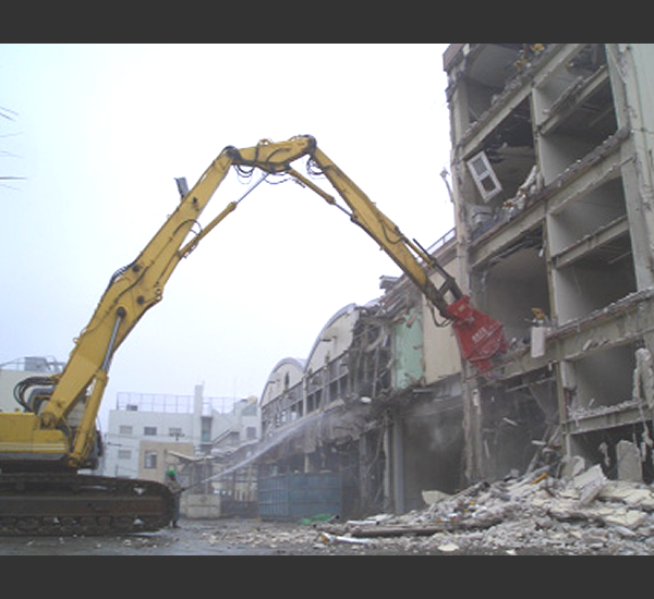 準工業地域での解体で重機20台(0.7~1.6クラス)で解体し、発生コンクリートを総て現場内で破砕しました。再利用の為、何万m3の砕石の移動に苦労しました。
