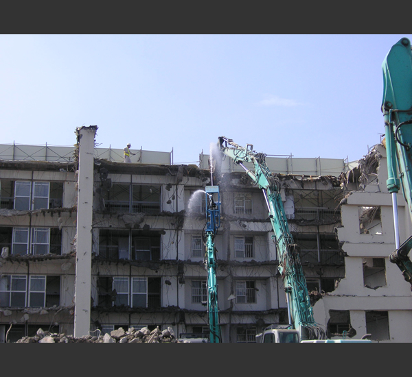 大規模の現場になると人力で散水するのも大変です。安全の面でも重機による散水機散水ロボは大変便利で今後の主流です。但し現在は7階23m位までが限界です。