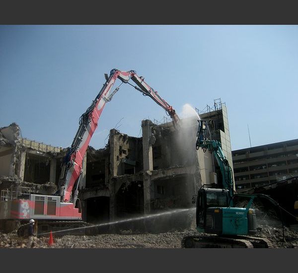 各所に吹き抜けが多く揚重工法不可の為、自重95tの大型ロングブーム(33m)で解体致しました。