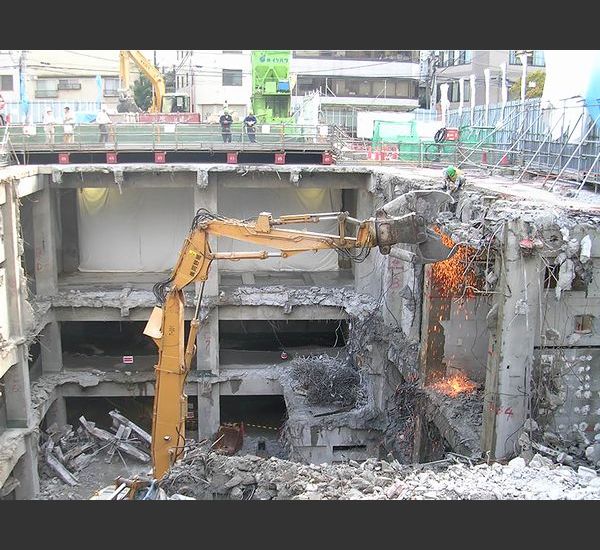 山留・切梁等従来の仮設を極力抑え、底盤上にロングブームを下ろし組立て、解体と言う今後の地下解体の一つの方向性が見つかった工事でした。