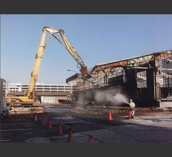 S造2Fの屋根・外壁スレートを高所作業車とローリング4段組みしての人力手払し作業が主体工事であった。